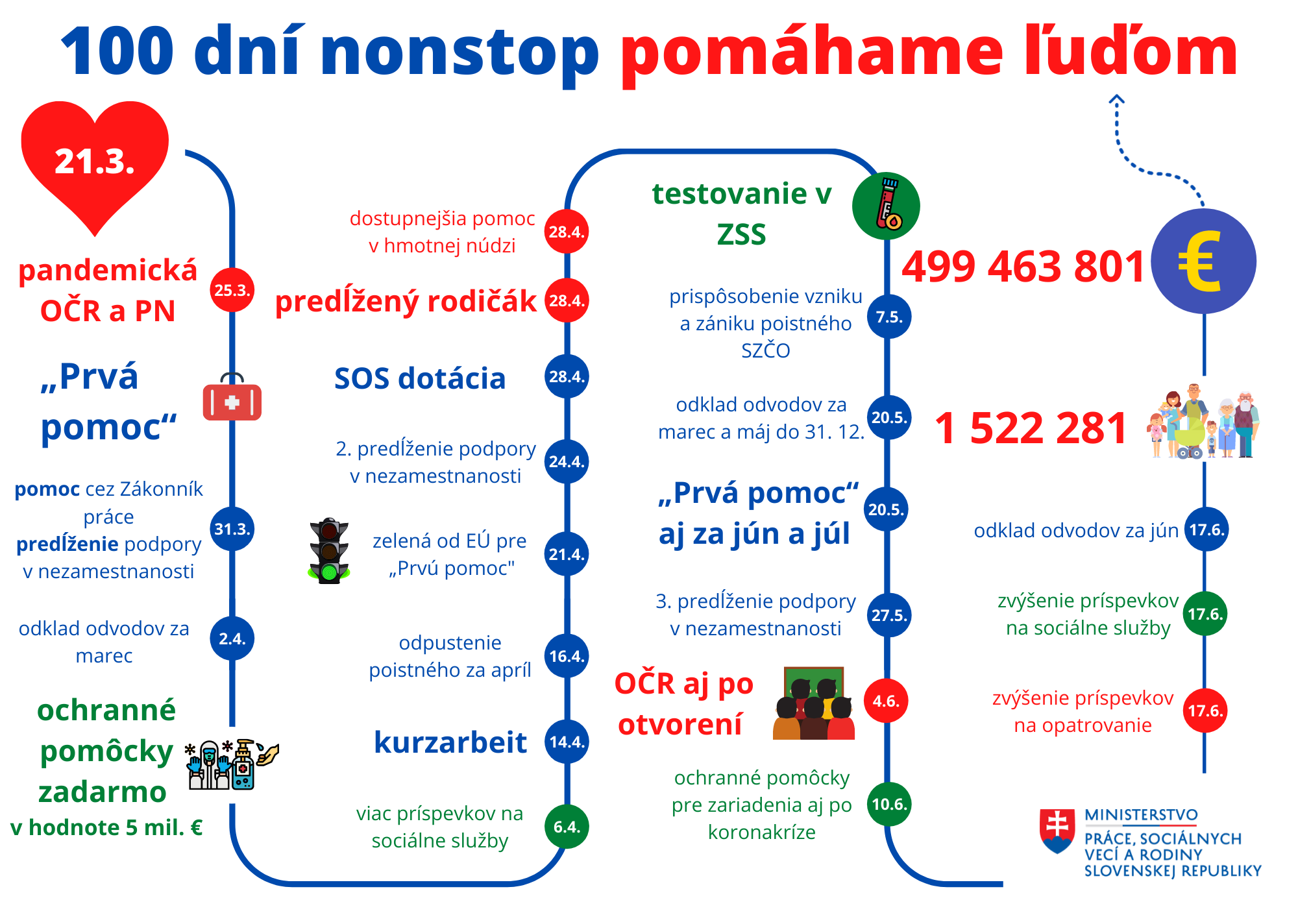 Za sto dní vyplatilo ministerstvo práce sociálnych vecí a rodiny pod vedením Milana Krajniaka vyše 499 000 000 eur, čím pomohlo viac ako miliónu obyvateľov, mnohým opakovane každý mesiac.