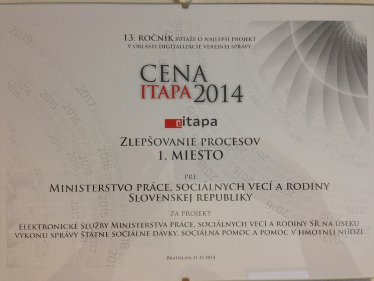 Po minuloročnom úspechu, keď si zo spomínaného podujatia odniesli cenu za Projekt roka, zabojovali aj tento rok. Výsledkom je víťazstvo v kategórii Zlepšovanie procesov. Porotcovia pridelili najviac bodov práve projektu elektronických služieb Ministerstva práce, sociálnych vecí a rodiny SR. Projekt zaviedol jednotnú elektronickú komunikáciu v rezorte práce, celkovo zefektívnil a zásadne urýchlil čas vybavovania, a v neposlednom rade sprehľadnil procesy pri vyplácaní sociálnych dávok. Systém má už vyše 10 000 aktívnych používateľov zo 60 organizácii a tieto sú rozmiestnené na viac ako 150 pracoviskách v rámci SR.