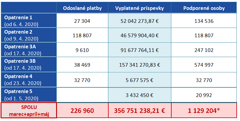 Za tri mesiace vyplatili úrady práce, sociálnych vecí a rodiny zamestnávateľom, SZČO a ľuďom bez príjmu viac ako 356 miliónov eur. Išli najmä na mzdy zamestnancov a podporu činnosti SZČO. Mnohí z nich dostali pomoc opakovane, niekoľko mesiacov po sebe. Príspevky budeme aj napriek uvoľneniu opatrení poskytovať aj za mesiace jún a júl.