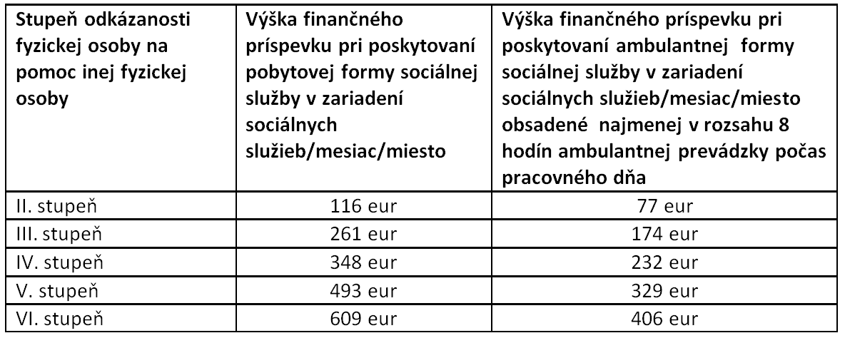 Pri sociálnych službách sa, podobne ako v predošlých rokoch, zvyšuje výška finančného príspevku na poskytovanie sociálnej služby podľa stupňa odkázanosti každého klienta. Výrazné zvýšenie spolufinancovania opäť reaguje aj na objektívny nárast nákladov v sociálnych službách, najmä vplyvom nevyhnutného zvyšovania miezd ich zamestnancov. Ten, ako je známe, vyplýva aj z výrazného zvyšovania minimálnej mzdy, či príplatkov za neštandardnú prácu v noci, cez víkendy, či počas sviatkov, ktoré sa práve zamestnancov v sociálnych službách určite výrazne dotýkajú . Napr. pri najťažšom stupni odkázanosti č.VI. sa od začiatku roka 2021 zvýši príspevok štátu na klienta zo súčasných 546 eur až na 609 eur mesačne. Treba podčiarknuť, že tieto príspevky sú určené výlučne na mzdy.