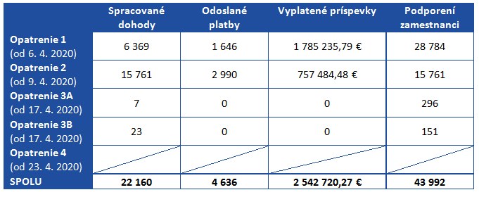 Od 6. apríla 2020 zaevidovali úrady práce, sociálnych vecí a rodiny 36 224 žiadostí o príspevky. Po spracovaní už pripravili na podpis žiadateľom 6 369 dohôd o poskytnutí príspevku na mzdy zamestnancov v rámci opatrenia 1. Ďalších 15 761 dohôd pôjde SZČO, ktoré v rámci opatrenia 2 požiadali o príspevok na náhradu straty príjmu. V opatrení 3 spracovali prvých 30 dohôd.