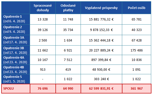 Od 6. apríla 2020 zaevidovali úrady práce, sociálnych vecí a rodiny 105 728 žiadostí o príspevky. Z nich spracovali 13 328 dohôd o poskytnutí príspevku na mzdy zamestnancov v rámci opatrenia 1. Ďalších 35 734 dohôd odišlo SZČO, ktoré v rámci opatrenia 2 požiadali o príspevok na náhradu straty príjmu. V opatrení 3 pripravili už 14 162 dohôd a v opatrení 4 ich spracovali 11 080.