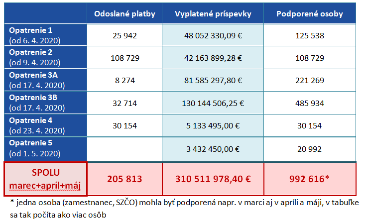 Zamestnávatelia aj SZČO môžu ešte stále zasielať úradom práce výkazy, resp. žiadosti s výkazmi za máj. SZČO ich môžu v rámci opatrenia 2 poslať najneskôr do 30. júna 2020. Zamestnávatelia, ktorí žiadajú o pomoc v rámci opatrenia 1 a 3 (3A, 3B), tak môžu urobiť najneskôr do 31. júla 2020. Úrady práce však od zamestnávateľov prijímajú do konca júna aj žiadosti a výkazy v rámci opatrenia 1 a 3 (3A, 3B) za mesiac apríl.