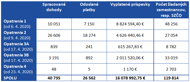 Od 6. apríla 2020 zaevidovali úrady práce, sociálnych vecí a rodiny 66 053 žiadostí o príspevky. Z nich spracovali 10 051 dohôd o poskytnutí príspevku na mzdy zamestnancov v rámci opatrenia 1. Ďalších 26 606 dohôd odišlo SZČO, ktoré v rámci opatrenia 2 požiadali o príspevok na náhradu straty príjmu. V opatrení 3 pripravili už 4 030 dohôd a v opatrení 4 ich spracovali 48.