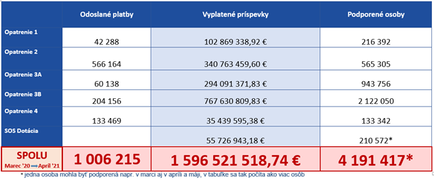 Zamestnávatelia a živnostníci už môžu žiadať o príspevky z projektu „Prvá pomoc“ za mesiac apríl pre všetky opatrenia, a to do 30. júna 2021. Na udržanie zamestnanosti Ministerstvo práce, sociálnych vecí a rodiny vyplatilo už 1 596 521 518,74 eur, čím podporilo celkovo 4 191 417 mesačných príjmov zamestnancov, vrátane SZČO. Všetky aktuálne informácie, dokumenty a žiadosti sú k dispozícii na www.pomahameludom.sk.