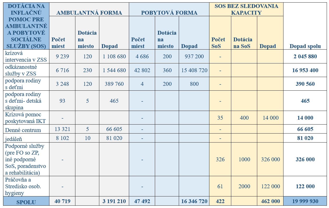 Ministerstvo práce, sociálnych vecí rodiny je balíkom inflačnej pomoci pripravené podporiť vyše 40-tisíc klientov v ambulantných zariadeniach a viac ako 47-tisíc klientov, ktorým sa poskytuje pobytová forma sociálnej služby. Treťou dôležitou skupinou sú podporné sociálne služby, kam patria práčovne, jedálne, strediská osobnej hygieny. Dotácia je určená aj na podporu subjektov, ktoré poskytujú sociálne poradenstvo, sociálnu rehabilitáciu, sociálne služby s využitím telekomunikačných technológií.